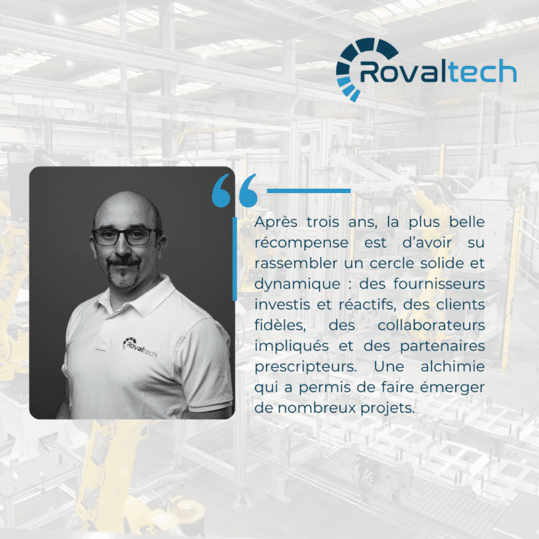 Rovaltech, une équipe professionnelle qui nous accompagne de l’étude de faisabilité jusqu’au support après la mise en service. C’est une équipe disponible, réactive et experte dans son domaine. La communication est efficace, aussi bien avec notre équipe technique qu’avec notre équipe utilisatrice en production. Rovaltech reste très disponible après la mise en service ce qui est très rassurant pour un client. Rovaltech est un référent dans le cadre de nos futurs projets.